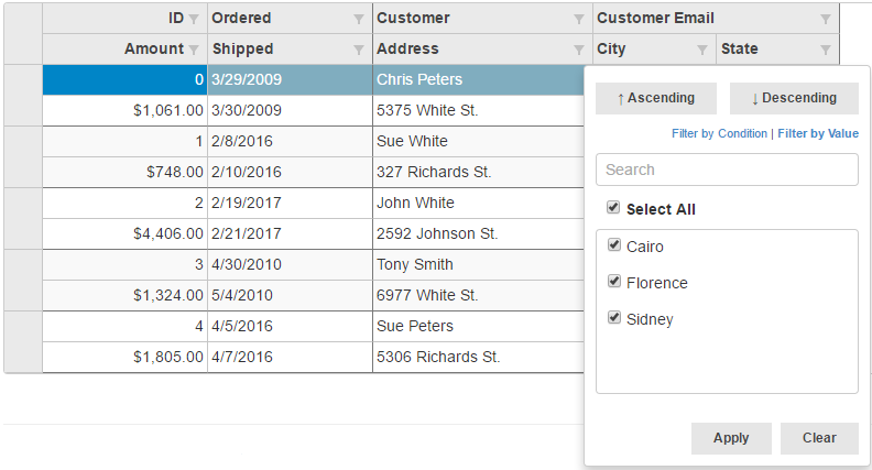 The following images show how the MultiRow control appears after applying Filter by Value and Filter by Condition to different columns. This example uses the sample created in the Quick Start topic.