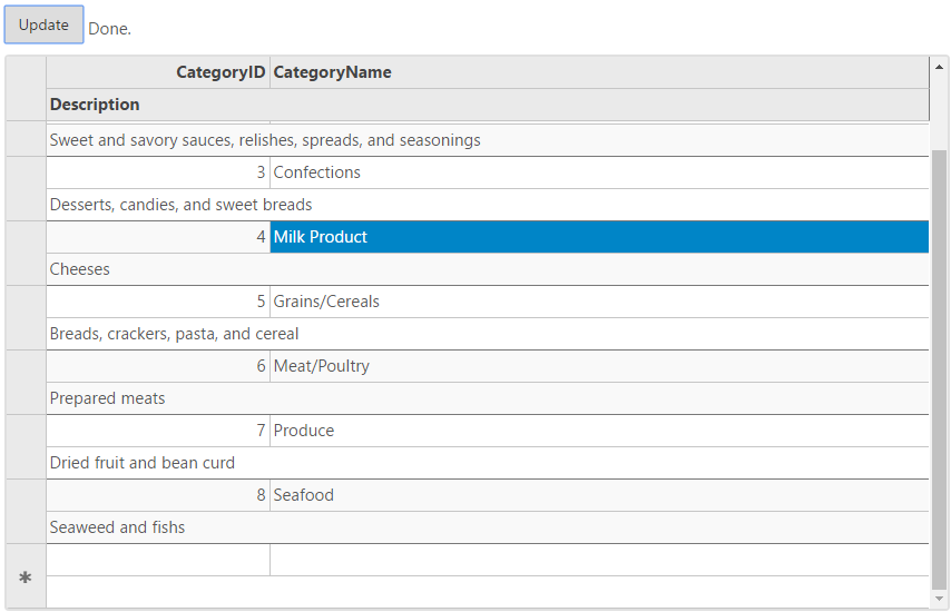 The following image shows the MultiRow control along with the Update button to commit the data using BatchEditActionUrl property. The example provides two ways to commit data to the server, one by pressing the Enter key after updating the content of a cell, and other by clicking the Update button.