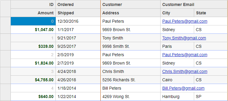 The MultiRow control allows you to create your own custom CSS files which are then added to your application. In most of the applications, you would want to show where each record and group starts or ends. The MultiRow control enables this by adding CSS class names to cell elements in the first and last row/column of each group. The class names are wj-record-start, wj-record-end, wj-group-start, and wj-group-end. You can use these built-in class names in CSS rules to customize the appearance of the record and group delimiters.