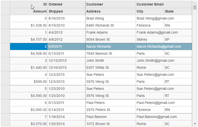 , lets a user select contiguous rows.The following image shows how the MultiRow control appears on setting SelectionMode to Row. This example uses the sample created in the Quick Start topic.