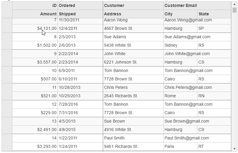 The following image shows how the MultiRow control appears after applying virtual scrolling to the large data set. This example uses the sample created in the Quick Start topic.