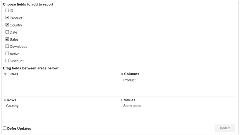 PivotPanel component is designed to provide an Excel-like drag-and-drop user interface that enables you to define custom views of the data. The control displays a list containing all the fields that exist in the data. Users can drag-and-drop these fields to lists that represent the row and column dimensions of the output table, the values summarized in the output data cells, and the fields used for filtering the data. When users modifies all these aspects of the view definition, the engine automatically updates the output data summary. Additionally, PivotPanel also manages the deferred update state of the engine.