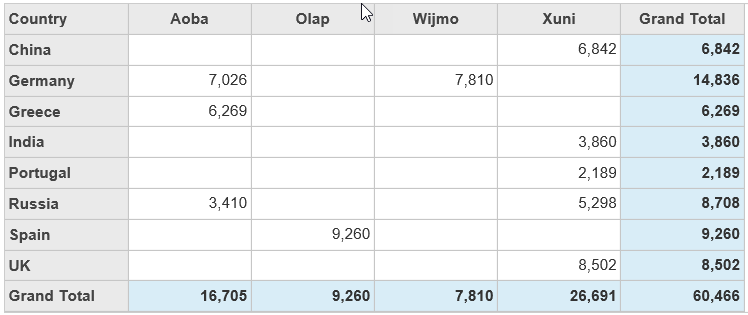 The PivotGrid displays data fetched from the data source in the form of Pivot tables. PivotGrid can be bound to a data source for populating it with an ordered dataset. The control provides automatic data binding with PivotPanel objects, grouped row and column headers, and custom behaviors for resizing columns, copying data to the clipboard, and showing details for a given cell.