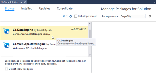 Install the DataEngine Web API and C1.WebApi packages from the NuGet server.