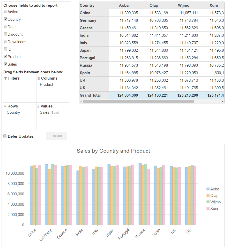 This topic describes the steps required to use the Data Engine service for data aggregation in OLAP. In the example below, the PivotEngine component connects the DataEngine data using the Data Engine Service. The PivotPanel control and PivotGrid control binds to the PivotEngine. You can change the view definition in the PivotPanel control. The aggregated data will be obtained from the service. In the example below, the PivotGrid control shows the aggregated data. You can find the detail raw data shown in a grid by double-clicking some cell in the PivotGrid control.