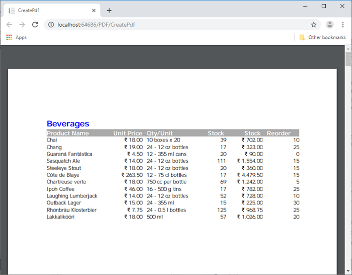 The quick start guides you through the steps of adding C1PdfDocument in your MVC web application and adding data to it. Complete the following steps to see how the data appears in the generated PDF after data binding: