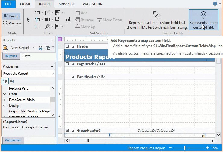 Confirm that the map icon is present in the C1FlexReportDesigner toolbar. If it is not included, you may need to add the following line to the <customfields> section of the C1FlexReportDesigner.4.5.2.exe.settings/C1FlexReportDesigner.4.8.exe.settings/C1FlexReportDesigner.6.exe.settings file: