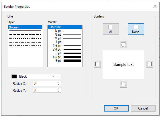 From the Properties window, select ellipsis next to Borders property. The Borders Properties dialog box opens.