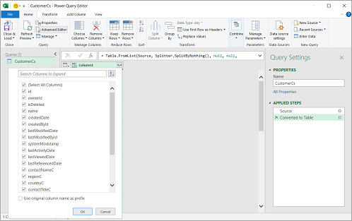 Click on the button with left and right arrow in the column header cell(having text Column1), and uncheck Use Original name as prefix in the dialog, then click OK. Finally, click Close & Load on the Home menu.