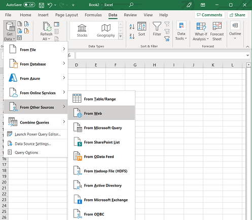 Switch to Data tab and choose Get Data>From other Sources> From Web.