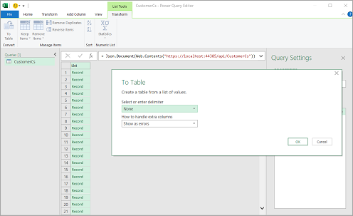 On the result window prompt which appears, choose Transform >To Table on the menu and then click OK.