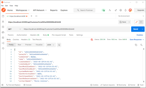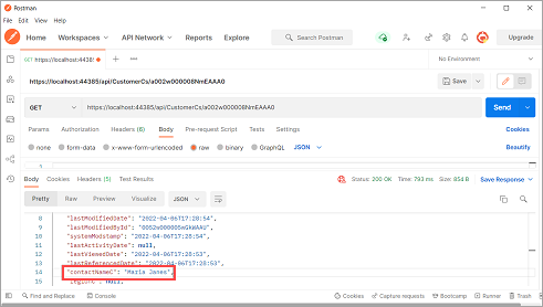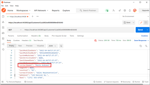 In the following screenshot, you can observe that a particular record has been fetched using GET(ID) method and has value "Maria Andrews" for contactNameC field.