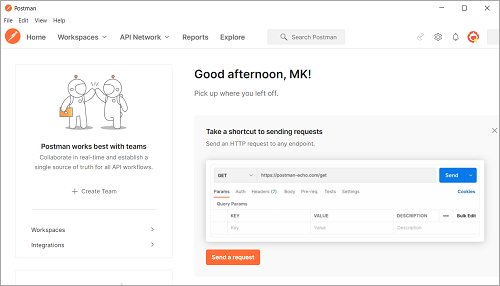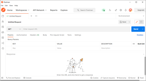 Let's start by installing Postman app. After successful installation, you can find the Postman app on your system by searching in the installed apps. Open the POSTMAN app and observe the default view as depicted in the screenshot below: