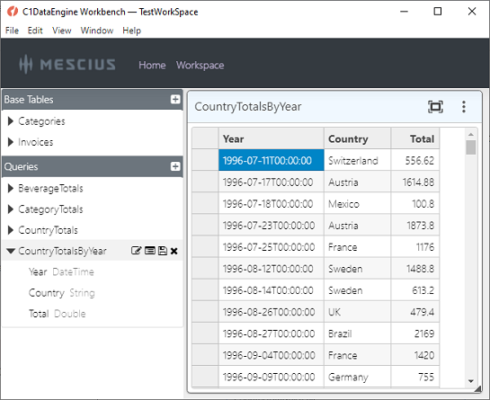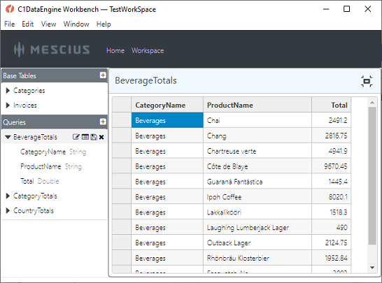 In the REVIEW tab, add the query name as 'BeverageTotals'. Click the CREATE button. The newly added query appears in the Queries panel. Display the results by clicking its grid icon.
