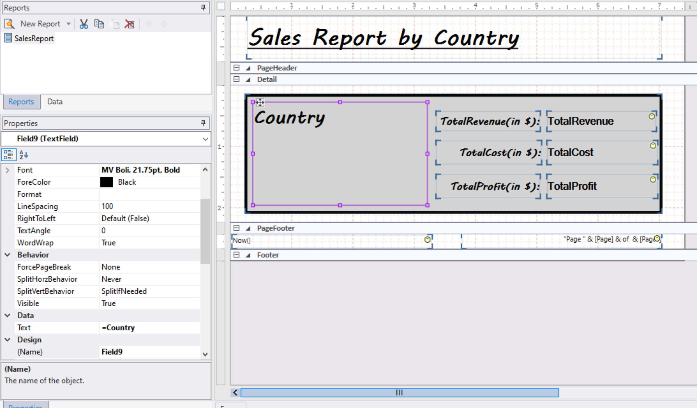 Initially you need to design a flat report based on the requirements. In this sample the flat report, displays sales data by country. First, add TextFields to the detail section for your database values, then design the layout that suits your needs. We have formatted the report in such a way that each record group will be shown in the form of a card, as presented in the following screenshot: