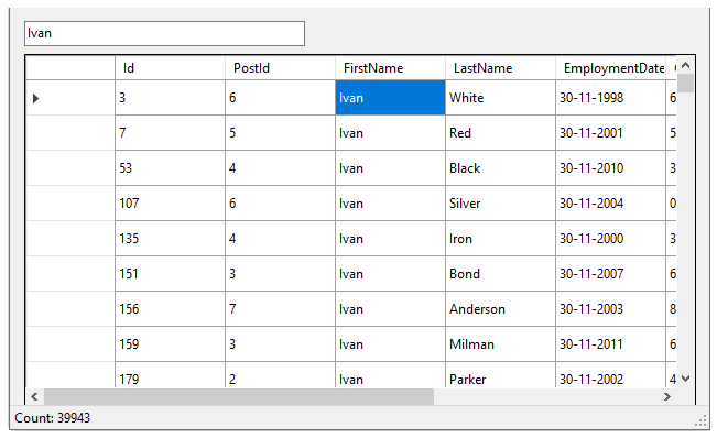 Add the following code to the TextChanged event of the TextBox. Add the FilterAsync method of the DataCollection so that you can filter asynchronously the FirstName from the list of data in the DataGridView. This method passes the FilterExpression property of C1DataEngineCollection class, which gets the filter expression applied to the data.