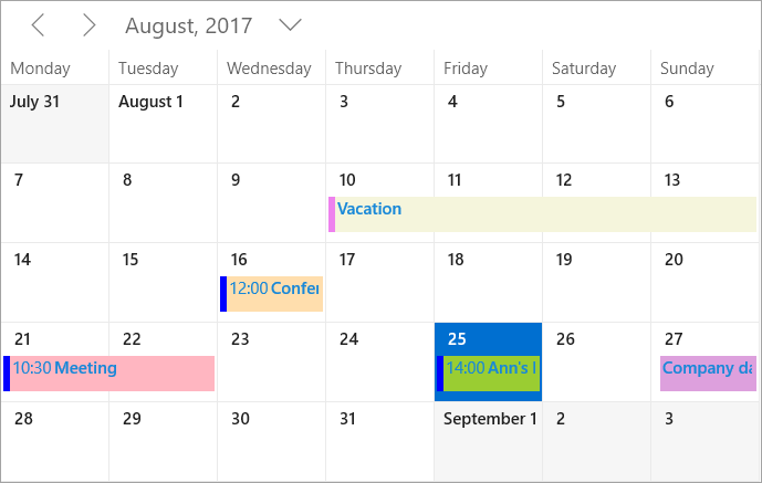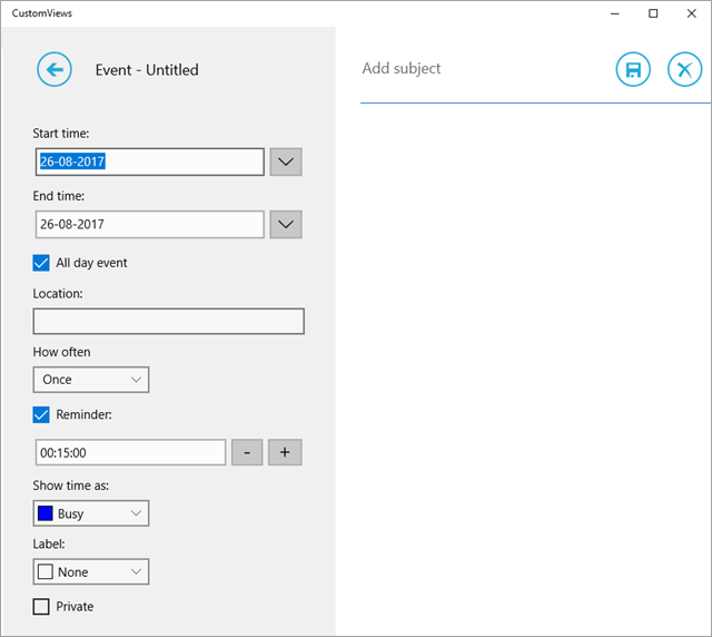 Double-click or double-tap a date or time to add a new appointment, or double-click or double-tap an existing appointment to edit it. Once you have tapped or clicked, the Appointment Dialog opens. You can also create a new appointment by pressing the Enter key on a date or time and specifying Subject in the text area. To add other details to this appointment, press the Enter key to open the Appointment Dialog. Add Location, Start time, End time, etc. in the dialog for the selected appointment.