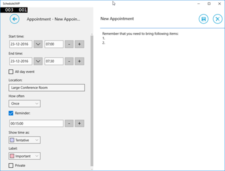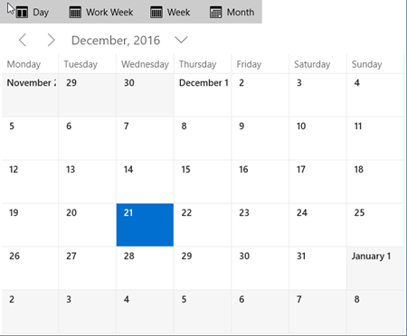 Congratulations! You completed the C1Scheduler Quick Start! In this topic, you created a Universal Windows application, added a C1Scheduler control and markup for buttons, and you added code for Button_Click events.