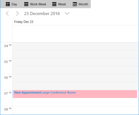 - When you tap or click the Save button, your appointment will be added to the C1Scheduler control. Note that this appointment is shown in Day View: