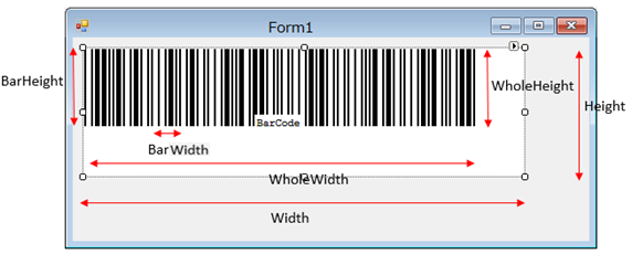 WholeSize: Lets you specify the size of the overall barcode. WholeWidth represents the width and WholeHeight represents the height of the overall barcode.