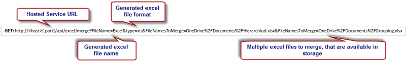 The following illustration depicts a request URL with parameters to merge multiple excel files available in configured storage.