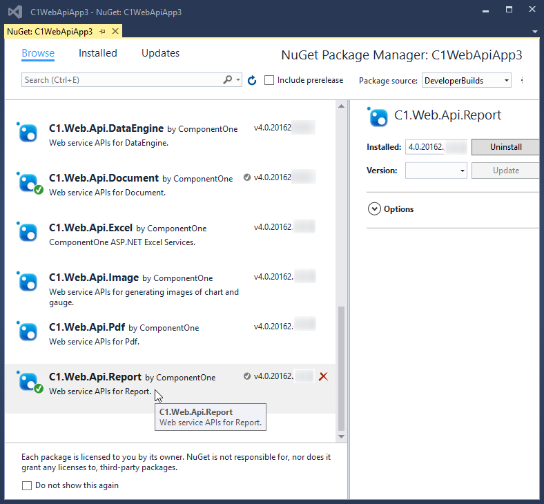 In the NuGet package manager the Report Service is listed as shown in the following image: