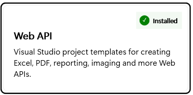 Click the Close button to close the installation screen once the installation is complete. The Free Trial screen shows the Installed label in green color in the Web API tile: