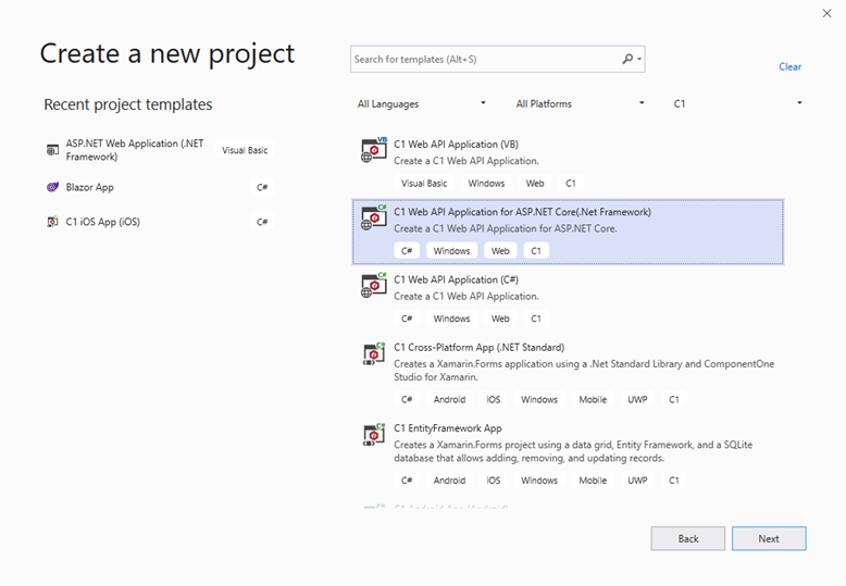 In the Create a new project window, select C1 from the Project Types drop down and select C1 Web API Application for ASP.NET Core (.Net Framework).