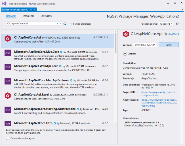 Add the C1 WebApi references to the project. In the Solution Explorer, right click Dependencies and select Manage NuGet Packages. In NuGet Package Manager, select https://api.nuget.org/v3/index.json as the Package source. Search for C1.AspNetCore.Api package, and click Install.
