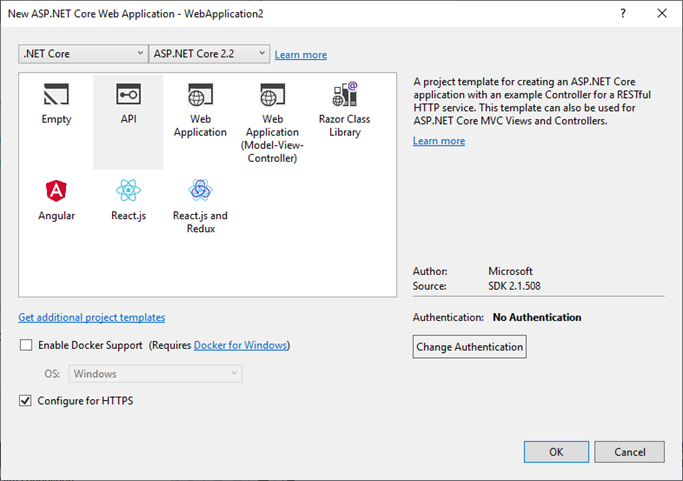 Select the .NET Core version as ASP.NET Core 2.2 and the project type as API from the template wizard and click OK to setup the WebApi application.