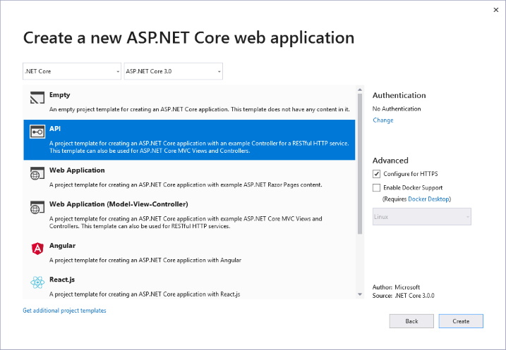 Select the .NET Core version as ASP.NET Core 3.0 and the project type as API from the template wizard and then click on Create to setup the WebApi application.