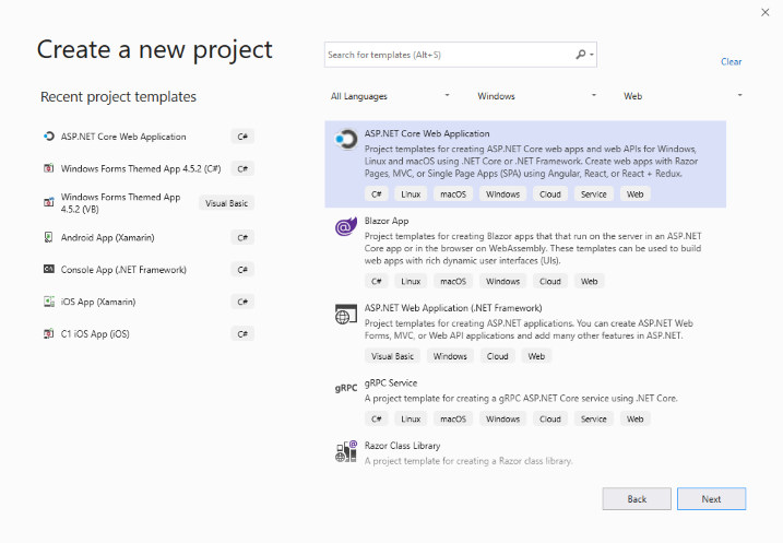 In the Create a new project window, select Web project type and then select ASP.NET Core Web Application template.