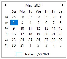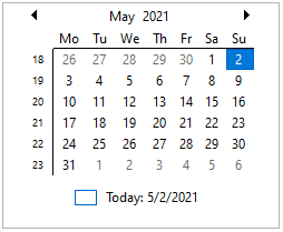 The CalendarView control provides the FirstDayofWeek property to assign one of the week days as the first day of the week. By default, Sunday is set as the first day of the week. But, CalendarView lets you set any day as the first day of week. For example, the following image shows Monday set as the first day of the week.