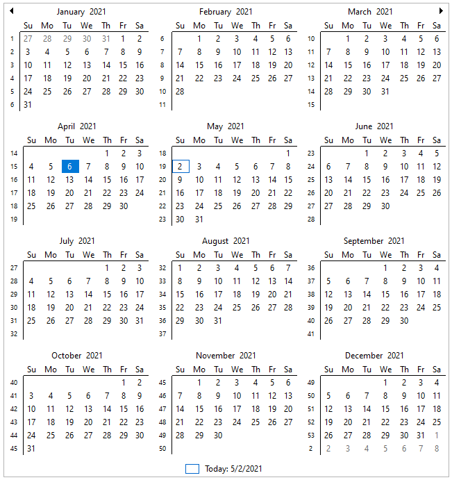 CalendarView supports multi-month view that enables you to create a full-year view to see several months of calendar on the same screen at the same time. A full year view is easily visible, scanned, and understood. It also lets you make the navigation and selection seamless for users. In addition, viewing a full year at a glance can make planning long-term activities and projects easier. For instance, it is easier to view holidays in a specific year when it displays all months in the multi-month mode.