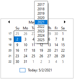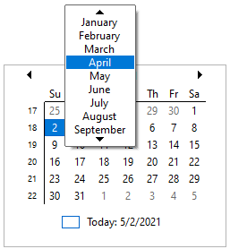 Clicking the month in calendar caption opens the popup month selector. The selector displays nine consecutive months, four before and four after the current month. CalendarView class provides PeriodSelectionType property, which has 'Field' as the default value. In order to display the pop-up year selector in CalendarView, set the PeriodSelectionType property to List.