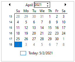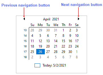 CalendarView consists of navigation buttons, Previous and Next, which allow you to go to the previous or the next month within the maximum and minimum date range.
