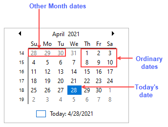 - Other month dates: Indicates the dates that belong to next and previous months, but lie in the same week as that of first or last date of the current month.