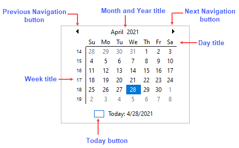 - Month and Year title: The month title, also known as calendar title appears at the top of calendar by default and displays the month and year.