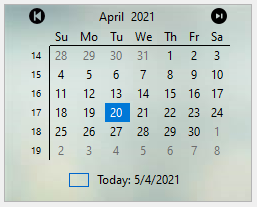 The following image displays calendar UI after implementing styling properties via Properties window such as BackImage, ImageArrowPrevious and ImageArrowNext properties applied to CalendarView.