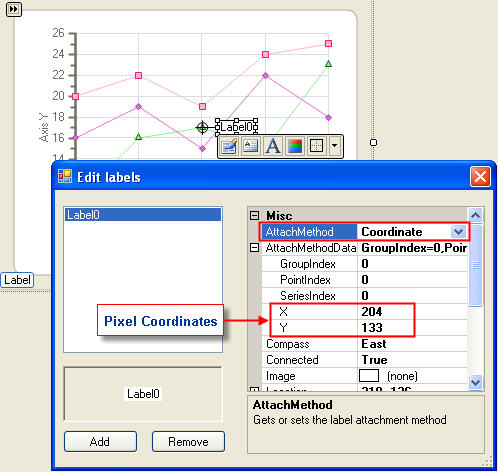 The Attached by Coordinate method item command gets the coordinate member of the AttachMethodEnum and sets the value of the AttachMethod property in the Label. It attaches the label anywhere on the chart. The following steps show how to attach the label using this method: