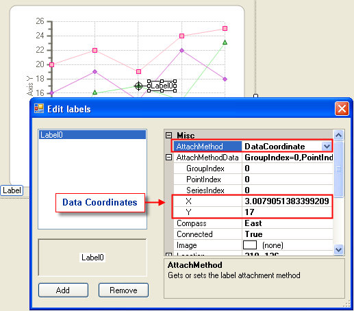 The Attached by Data Coordinate method item command gets the DataCoordinate member of the AttachMethodEnum and sets the value of the AttachMethod property in the Label. It attaches the label anywhere inside the plot area of the chart or to the specified coordinate location. To attach the label as a data coordinate, complete the following steps: