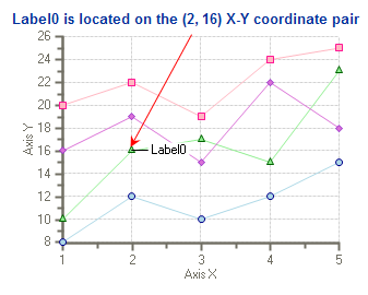 If you would like the label to represent a different coordinate pair then simply change the X and Y coordinates in the Edit labels editor. For example, let's say we would like the label on the (2, 16) coordinate pair. In the Edit labels editor we change the X value to 2 and the Y value to 16. The label appears on the (2, 16) X-Y coordinate pair. The image below shows the new position of the label.