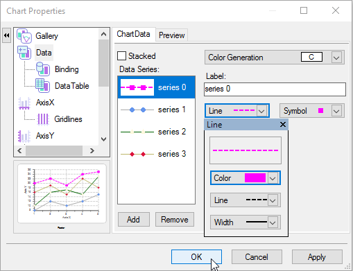 Select Series0 and click on the drop-down arrow for the Line property. Modify its Color, Line style, and Width style for its Line property to the following: