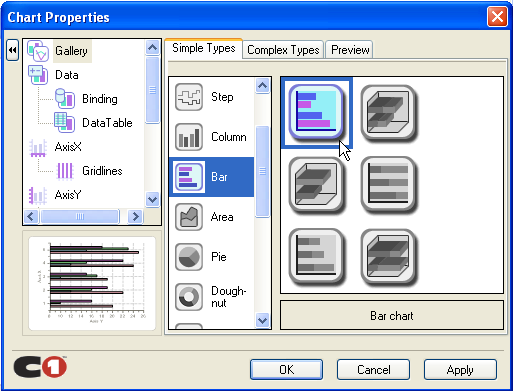 The first step in configuring a chart through the smart tag wizard is to select a gallery type from the wealth of chart types available. From basic chart types like Bar and Lines to more complex charts like Polar and Surface, C1Chart allows you to deal with any data visualization needed.