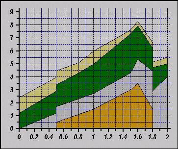 Problems arise with the stacked chart if the first series in the data set does not contain points that match up to the Min and the Max points of the other series. If the first series of the chart does not contain the amount of X values as successive series, then these series no longer have a definite starting point as in the image below. C1Chart deals with this irregularity in a logical manner. The data where the Y values for the first series do not exist are taken to be 0. Then each successive series is added onto this creating a discontinuity, best demonstrated by the following Stacked Area chart: