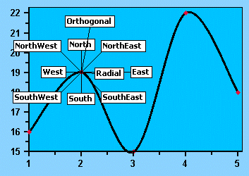 The Compass property acts similarly on ChartLabels as it does other objects in .NET. The Label is placed away from the point according to the specified compass direction. The LabelCompassEnum.Radial setting generally applies only to Polar, Radar, and Pie charts. It places the Label out radially from the center of the chart. This can be a convenient feature if a chart, such as a Pie chart, has a multitude of labels to be shown. The LabelCompassEnum.Orthogonal setting places the Label perpendicularly from the path of the series line. For instance, if there was a straight horizontal line as the series plot, then the Orthogonal position would be exactly like the North Compass setting, likewise if there was a straight vertical line as the series plot, then the Orthogonal position would be exactly like the West Compass setting.