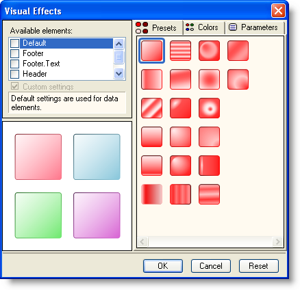 Visual Effects is a tool used for visually enhancing the Chart2D control's elements such as the data series, header, and footer. Any existing project can use the new features provided by this tool. The chart's appearance can dramatically improve in a few simple steps using the Visual Effects designer.