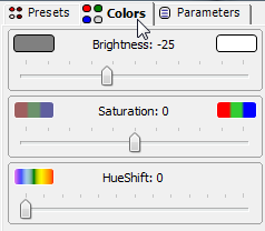 The Colors tab page includes a slider for the color's brightness, saturation, and hue shift. Brightness, Saturation, and Hue represent the red, blue, and green color scheme. This makes it possible to achieve any type of color tone you want for the chart element by changing its brightness and saturation rather than limiting you from specific colors. You can even change all of the colors using the HueShift slider. For more information on using the color slider for chart elements, see Use the Color Sliders to Enhance an Existing Color for the Chart Data Series or Use the Color Sliders to Enhance an Existing Color for the Chart Header and Footer.