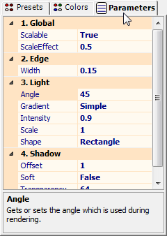 The Parameters tab includes properties for the Chart2D elements scaling, edge, light, and shadow effects. With these properties you have endless possibilities in customizing your chart's elements. For more information on these properties, see Visual Effects Parameters.