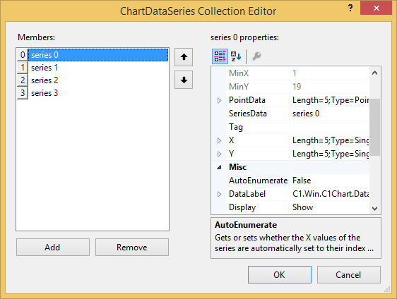 The ChartDataSeries Collection Editor allows the user to add or remove data series and modify their properties. For more information on the ChartDataSeries, see Defining the ChartDataSeries Object.
